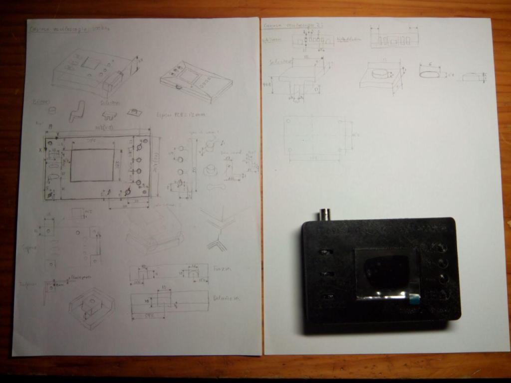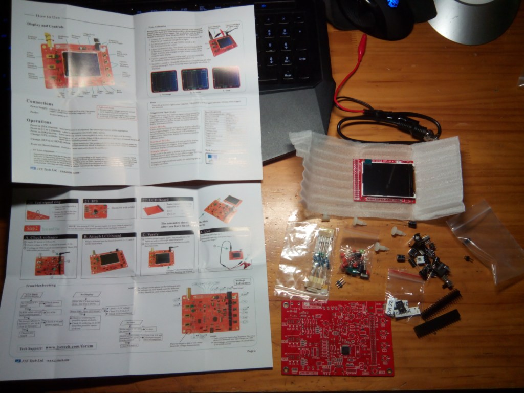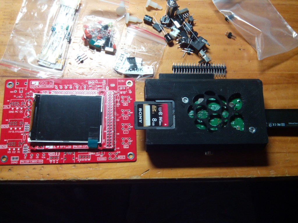 El kit consiste en todos los componentes necesarios para montar (soldando) el osciloscopio en cuestión. Se suministra sin carcasa, de ahí la necesidad de diseñar una para proteger la electrónica y hacer su uso mas manejable.
