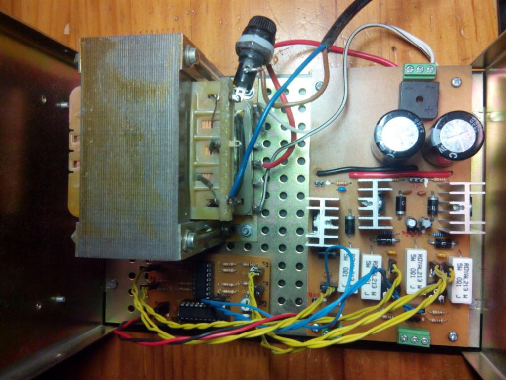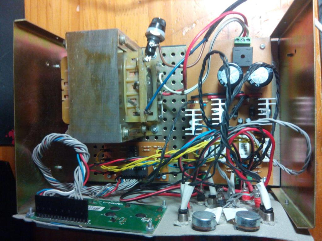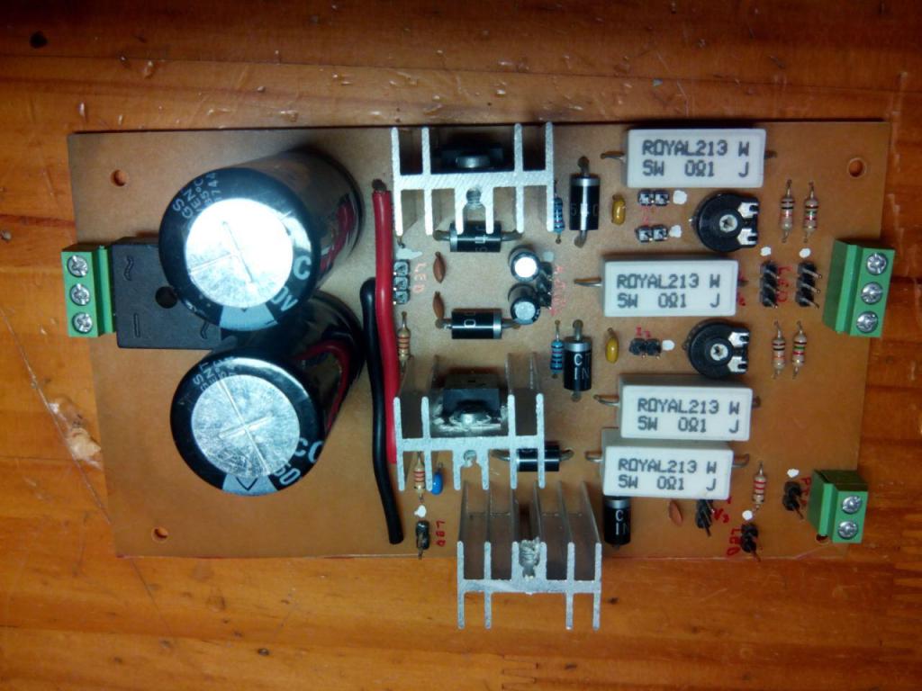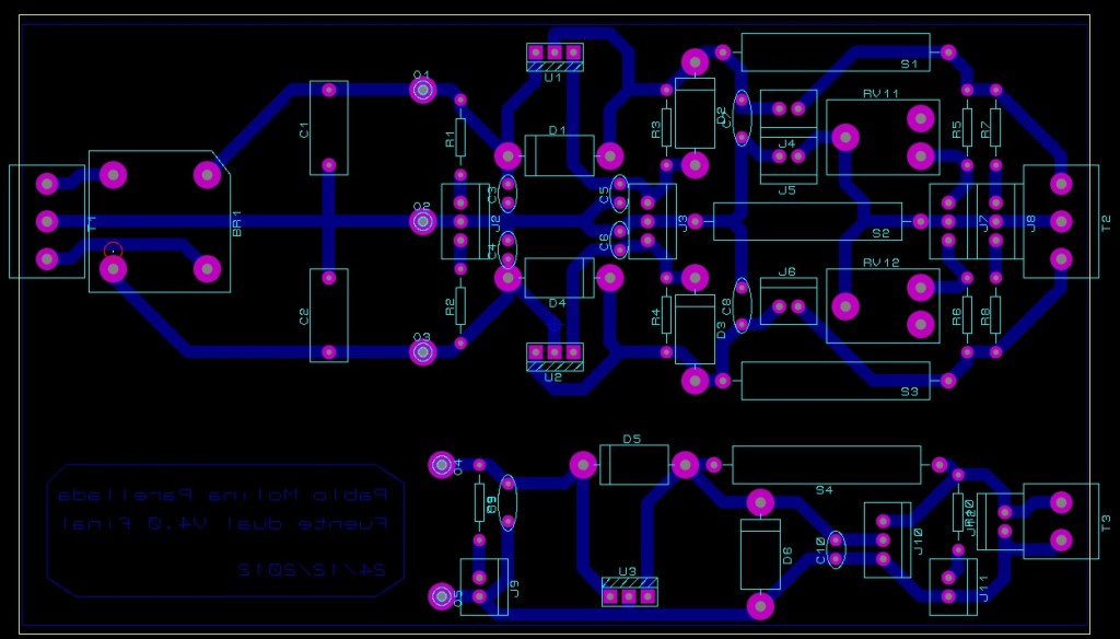 Contiene los componentes de la parte de potencia: rectificador, filtros de rectificado, filtros de entrada, los integrados de regulación de tensión (uno de 5V, ajustable + 1,23-36V y ajustable negativo -1.23-36V), potenciómetros para regular la tensión, los filtros de salida, resistencia para medir intensidad, diodos led y conectores para lecturas de tensión e intensidad.
