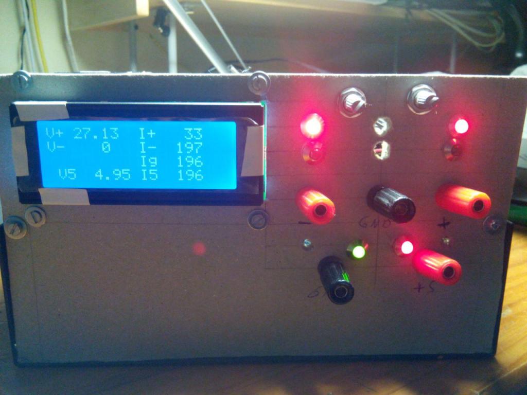 Actualmente la fuente puede suministrar potencia y puede regularse en voltaje. En la imagen anterior se aprecia como las medidas de intensidad son irreales. Esto es debido, presuntamente, a un fallo con el circuito de amplificación pendiente de solucionar.