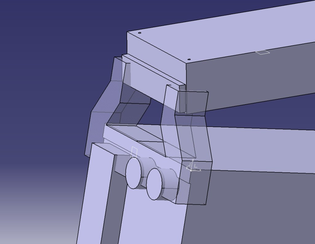 Una parte importante del diseño era que el soporte delantero que se apoya en la parte media de la caja no llevara tornillos, ya que eso implicaría taladrar una parte muy visible de la caja. Para esto he optado por poner unas patillas que abrazan la caja por la parte superior. La longitud de estas patillas también debe estar controlada para permitir retirar los paneles laterales sin tener que desmontar el radiador.