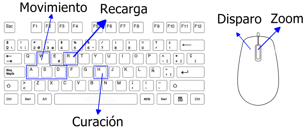 - H para curar, si tenemos botiquines disponibles y si no estamos con la vida llena.